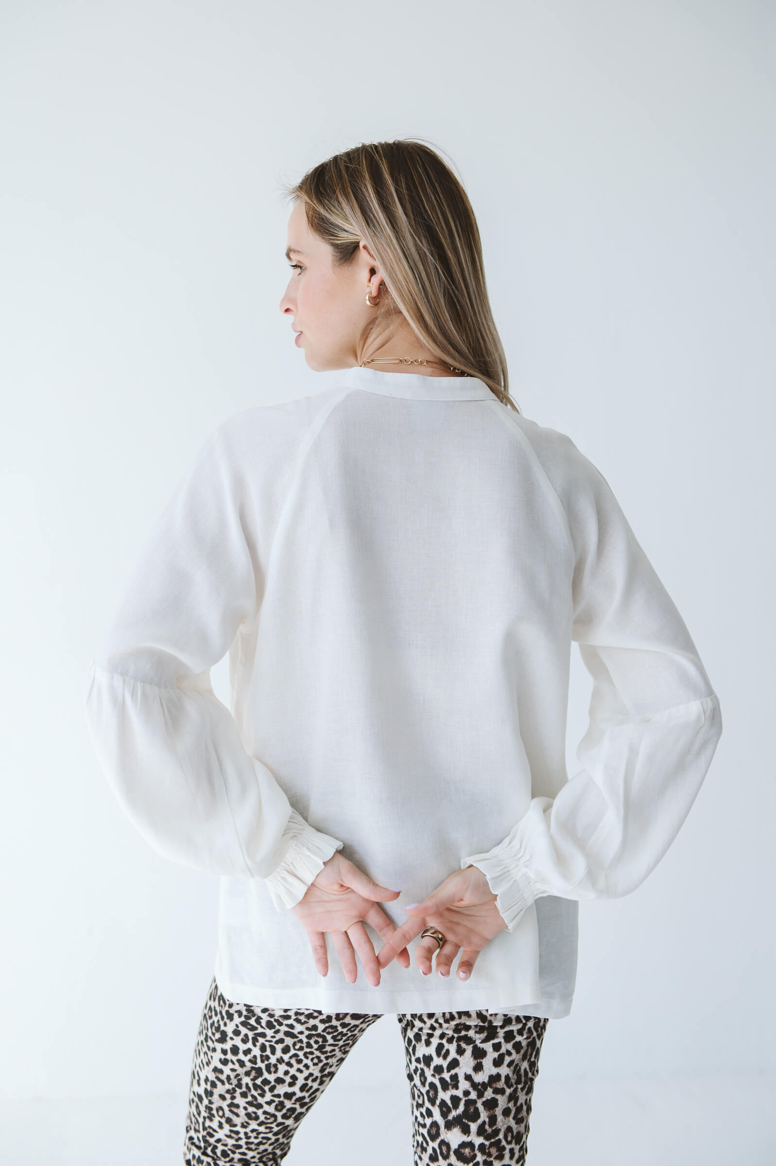 The Denny Shirt in Milk is designed to make everyday styling feel effortless. She gives you two looks in one with her reversible design, wear her front to back or back to front depending on how you feel like styling her. The softly elasticated bell sleeve creates a beautiful shape that feels elegant, comfortable, and flattering on the arm. She's easy to pair with our Tayla Barrel trousers, Enya denim trousers, or more tailored Renata leopard print trousers. Wear her tucked in or left loose.