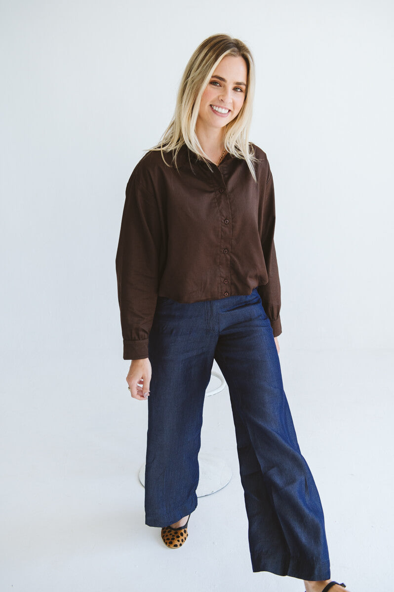 The Page Shirt in Chocolate is an easy-to-wear piece that can either be the focal piece of your outfit or the perfect addition to complete it. Features a classic collar and functional buttons. It is self lined so it can be worn as a shirt or left open as a jacket.